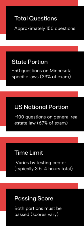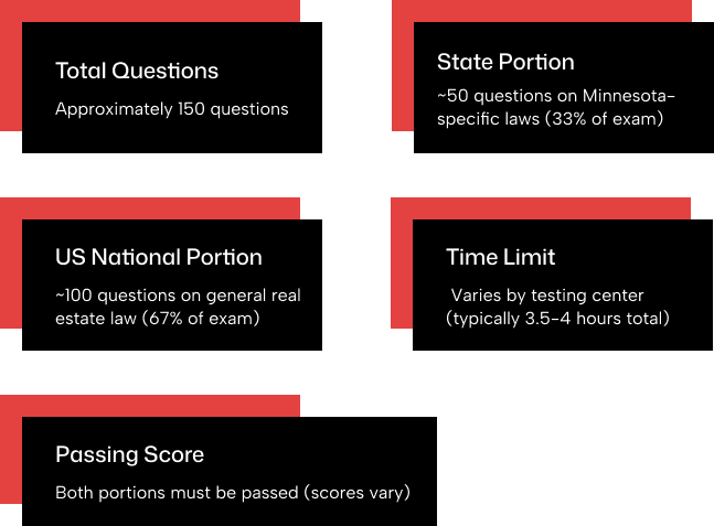 The Minnesota real estate licensing exam is actually two exams in one: a state-specific portion covering Minnesota laws and a national portion covering general real estate principles.